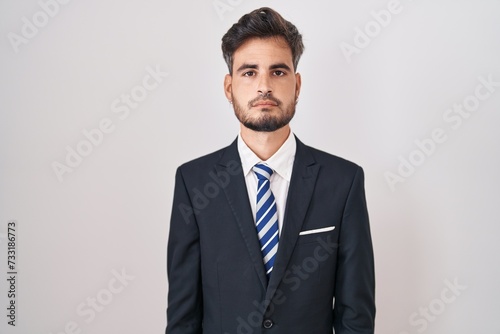 Young hispanic man with tattoos wearing business suit and tie relaxed with serious expression on face. simple and natural looking at the camera.