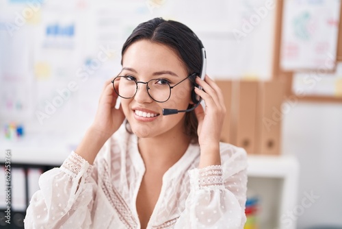 young, chinese, asian, hispanic, latin, woman, female, adult, person, beautiful, business, men at work, working, success, manager, boss, employee, cyberspace, online, device, calling, speaking, talking, conversation, sitting, table, smile, smiling, confident, earphones, listening, hearing, sound, agent, support, operator, street, town, city, urban, road, outdoors, outside, exterior, background