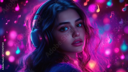 young, hispanic, woman, music, earphones, neon, light, listening, vibrant, colourful, portrait, girl, sound, audio, technology, entertainment, relaxation, enjoyment, nightlife, glow, harmony, youthful, dusk, emotion, melody, mood, modern, trendy, club, ambience, vibe, expression, culture, rythm, chic, fashion, spotlight, dynamic, artistic, enjoying, luminescent, beauty, visual, pop