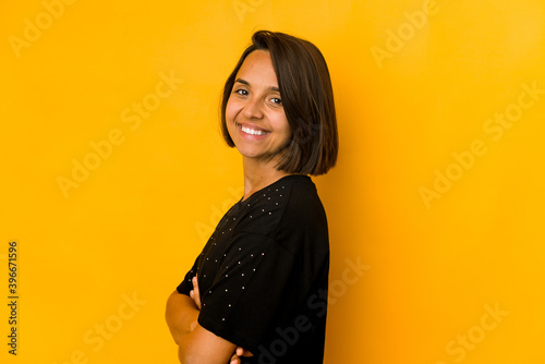 Young hispanic woman isolated on yellow happy, smiling and cheerful.