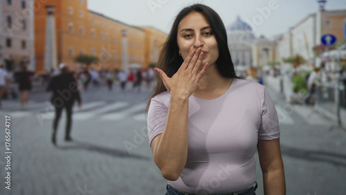 woman, hand, kiss, street, hispanic, young, city, urban, female, smiling, joy, affection, laughter, greeting, warmth, friendship, gesture, expression, connection, emotion, hand, palm, laugh, blowing, outdoors, public, movement, holiday maker, travel, vacation, sightseeing, candid, daylight, sunlight, posing, earring, jean, t-shirt, casual attire, grin, posture, friendly, welcoming, everyday, authentic, crowd, building, crosswalk, piazza