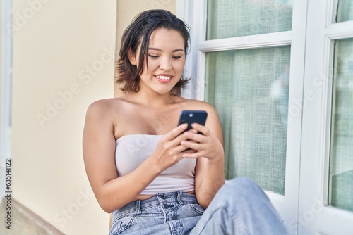 young, chinese, asian, hispanic, latin, woman, female, adult, person, beautiful, happy, happiness, confident, confidence, looking, cool, smile, lifestyle, expression, positive, joy, smiling, laughing, enjoy, fun, sunlight, sunny, fashion, casual attire, smartphone, phone, mobile phone, texting, message, typing, cyberspace, online, technology, sitting, street, town, city, urban, road, outdoors, outside, exterior, background