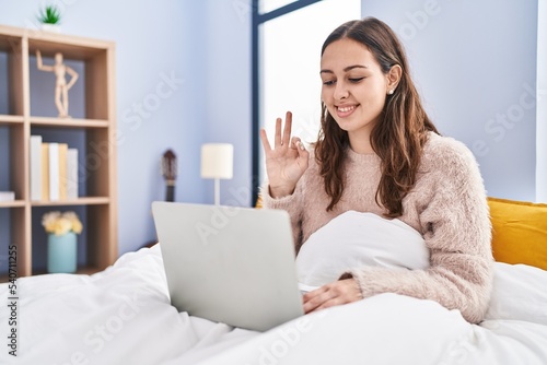 Young hispanic woman using computer laptop on the bed doing ok sign with fingers, smiling friendly gesturing excellent symbol