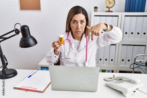 Young hispanic woman wearing doctor uniform holding pills at the clinic pointing down looking sad and upset, indicating direction with fingers, unhappy and depressed.