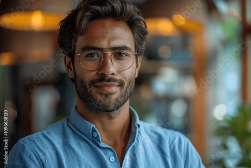 Young Indian Businessman Holding Tablet in Modern Office Walking and Thinking with Glass Walls Professional Male Executive in Blue Shirt with Glasses Confident Entrepreneur Planning Solutions