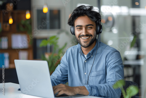man, businessman, indian, headset, laptop, office, smiling, gesticulate, young, meeting, support, service, sitting, shirt, employee, explaining, client, computer, listening, help, adviser, entrepreneur, working, desk, freelancer, education, studying, startup, technology, online, operator, talking, expert, training, teacher, student, manager, salesman, muslim, hindu, hispanic, arab, india