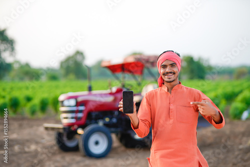 young indian farmer standing with tractor and showing smartphone at field