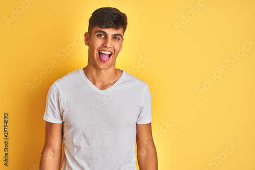 Young indian man wearing white t-shirt standing over isolated yellow background sticking tongue out happy with funny expression. Emotion concept.