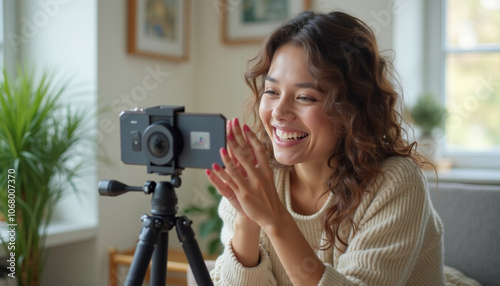video, content, social, media, engagement, camera, tripod, joy, interaction, audience, smile, digital, branding, happiness, lifestyle, recording, young, female, fun, creativity, entertainment, expression, personality, storytelling, energy, passion, reaction, platform, communication, inspiration, art, trend, online, technology, sharing, life events, moment, motivation, narrative, charming, excitement, relaxation, positivity