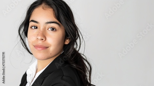 portrait, 1, girl, woman, young, latin, spanish, person, american, 20s, eye, face, looking, side, formal, clothing, elegant, suit, studio, shot, light, white, background, profile, business, concept, casual attire, regular, photogenic, people
