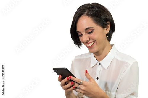 young latin american woman receiving happy news on her cell phone