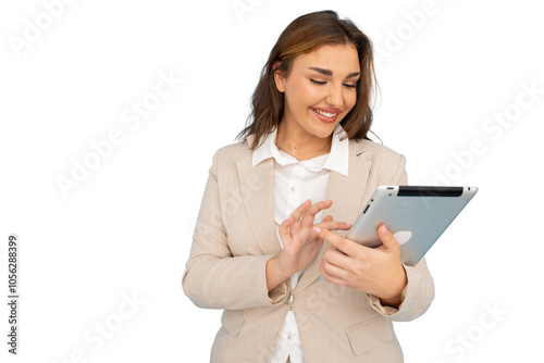 businesswoman, person, business, people, businessperson, portrait, woman, entrepreneur, finance, female, tablet, cyberspace, online, app, online shopping, success, corporate, manager, ceo, working, employee, leader, hispanic, caucasian, spanish, mexican, background, transparent, isolated, company, job, young, boss, technology, diversity, equality, happy, luxury, femininity, confidence, adult, lifestyle, latin