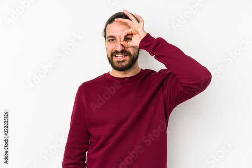 Young long hair man isolated on a white background excited keeping ok gesture on eye.