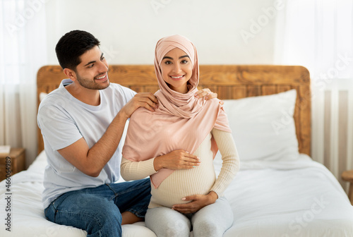casual attire, smile, man, pregnancy, couple, cuddling, spouse, bed, hand, indoor, pregnant, stomach, maternity, tender, holding, shoulder, happy, married, love, waiting, affectionate, husband, adult, male, wife, young, free space, father, mother, together, copy space, woman, empty space, tummy, expecting, belly, parenthood, female, home, family, abdomen, healthy, arab, middle eastern, islamic, muslim, arabic