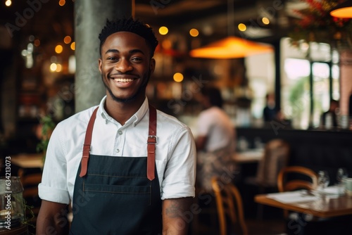 Young male african american waiter working in a cafe bar in the city portrait