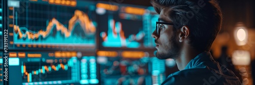 analyst, financial, market, monitoring, night, office, young, male, modern, technology, professional, work, occupation, business, finance, economy, computer, screen, chart, graph, datum, analysis, investment, trading, strategy, concentration, attention, decision, focused, evening, corporate, employment, job, expertise, dedication, management, information, research, evaluation, performance, trend, stock, security, digital
