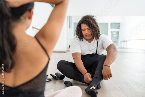 young male ballet dancers couple partners concentrated preparing before class; african american man getting ready putting on dance shoes and leotard