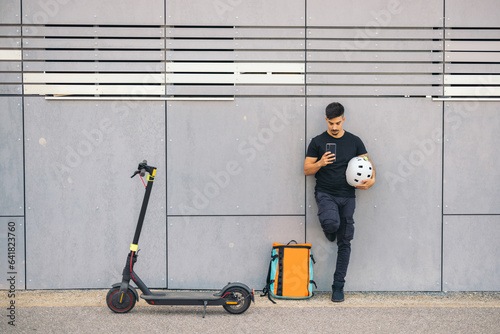 delivery man, using, smartphone, helmet, backpack, browsing, online, courier, connection, delivery, street, electric, city, modern, lean, man, device, mobile, transport, contraption, vehicle, phone, urban, road, male, cyberspace, wall, safety, surfing, order, work, young, mobile phone, bag, service, men at work, thermal, app, outdoors, full body, full-length, tattoo, serious, sharpened, condensed, moustache, front view