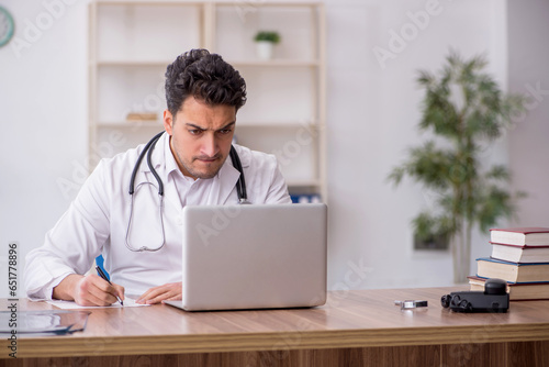 doctor, working, clinic, hospital, medicine, health, health care, care, remote, computer, laptop, online, cyberspace, note, writing, taking, young, trainee, intern, student, practice, job, examining, disease, prescription, surgeon, check-up, medicals, physician, practitioner, recovery, recovering, insurance, healer, consultation, man, discussing, explaining, treatment, diagnosis, diagnostic, specialist, check-up, healthy, work, occupation