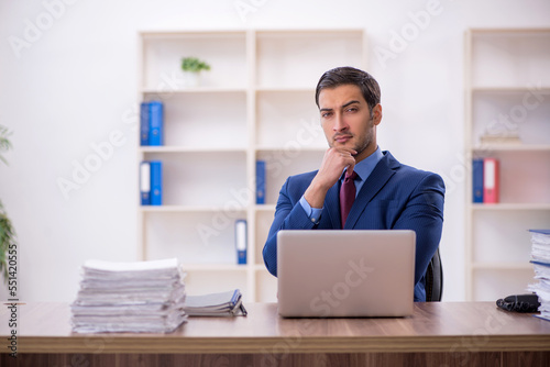 Young male employee and too much work in the office