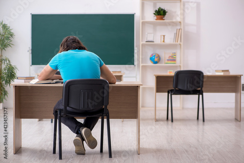 Young male student in front of green board
