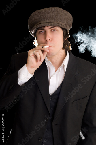 man, male, 1, person, guy, individual, personality, character, unique, theatrical, caucasian, photogenic, black, straight, look, expression, eccentric, old-fashioned, fashion, nice, hat, cap, shirt, jacket, style, self-assured, adult, 30s, 20s, vintage, white, backlit, backlight, grey, retro, cigarette, outmoded, young, lighting, habit, bad, smoking, hand, pocket, pose, suit, isolated, thoughtful, smoke