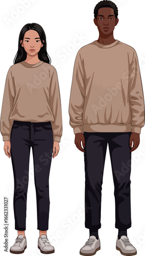 man, woman, person, people, casual attire, clothing, standing, full body, young, adult, male, female, portrait, fashion, outfit, shoe, pant, sweatshirt, top, neutral, expression, front view, human, diversity, lifestyle, model, urban, modern, youth, relaxed, simple, style, isolated, character, vector, illustration, body, pose, two people, caucasian, african, ethnicity, casual clothes, contemporary