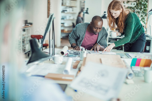 young, man, woman, working, project, startup, office, smiling, teamwork, collaboration, african ethnicity, caucasian, diverse, mixed, laptop, young adult, two people, architect, designer, entrepreneur, business, creativity, innovation, success, ambition, achievement, professional, cooperation, colleague, co-worker, meeting, brainstorming, planning, discussing, copy space, diversity, partnership, workplace, career