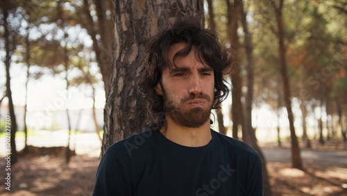 young, man, eats, disgust, food, bad, tasting, vomit, tree, nature, outdoors, forest, reaction, sick, nausea, greenery, meal, accident, wilderness