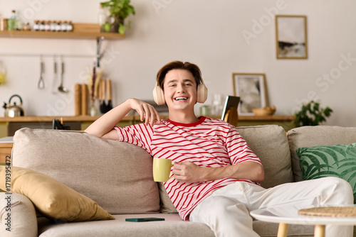 young men, music, earphones, hot drink, study, online, e-learning, home, student, apartment, freelance, studying, cosy, relaxed, couch, comfortable, lifestyle, leisure, technology, education, focused, concentration, stylish, interior design, furniture, informal, productive, wellness, young adult, serene, calmness, joy, key
