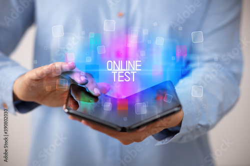Young man holding a foldable smartphone with ONLINE TEST inscription, educational concept
