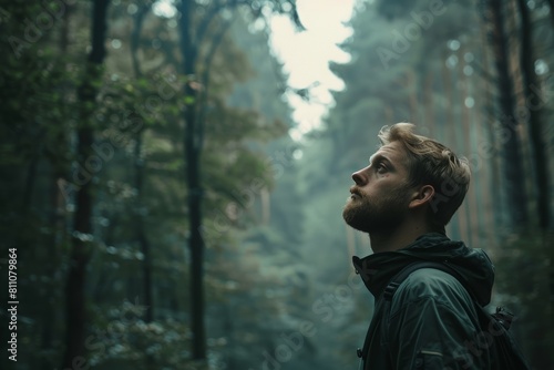 man, forest, fog, mystery, exploration, contemplative, young adult, adventure, solitude, hiking, tranquil, serene, wilderness, nature, environmentally friendly, environmental, thoughtful, explorer, wanderlust, natural beauty, greenery, mist, introspective, peaceful, mindfulness, relaxation, calm, peacefulness