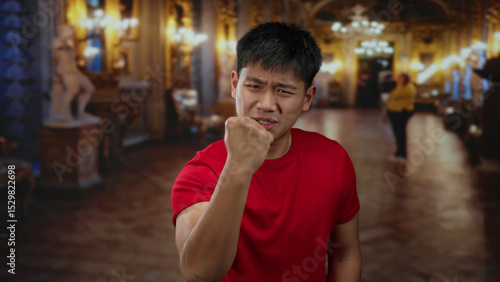 man, young, museum, indoor, chinese, art, emotion, red, shirt, expression, history, culture, interior, decor, antique, classic, artwork, sculpture, heritage, architecture, lighting, ornate, exhibit, building, room, background, ambience, pose, intensity, fist, display, visitor, gallery, fashion, attire, style, male, holiday maker, travel, indoor, person, gesture, attitude, scene, view, sharpened, drama, setting