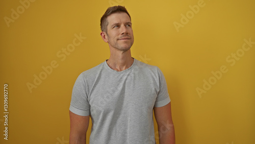 man, young, caucasian, adult, photogenic, attractive, portrait, male, background, yellow, isolated, casual attire, thoughtful, confident, modern, fashion, trendy, cool, posing, shirt, relaxed, smiling, bright, style, expression, face, individual, charming, light, simple, t-shirt, neutral, hair, model, person, looking, contemporary, youthful, alone, standing, contemplative, clean, vibrant, aesthetic, minimal, indoor, space, casual clothes