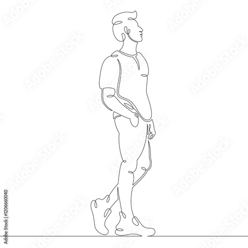 Young man in modern fashionable clothes. One continuous drawing line, logo single hand drawn art doodle isolated minimal illustration.