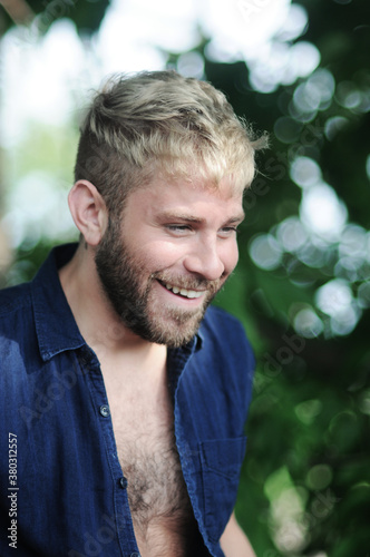 adult, attractive, beard, green, joy, laughing, lifestyle, male, man, outdoors, portrait, relaxed, shirt, smile, spring, summer, sun, having fun, hispanic, latino, person, people, adult, 20s, grown-up