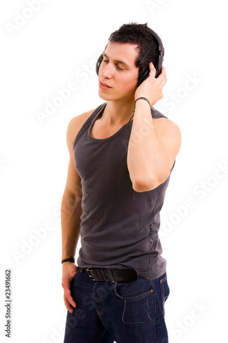 adult, alone, background, black, calm, casual attire, close, closeup, colours, copy, enjoy, face, fresh, friendly, guy, photogenic, happy, head, hear, human, indoor, isolated, joy, joyful, life, lifestyle, listen, male, man, modern, music, natural, new, 1, peace, people, person, portrait, relax, single, space, studio, technology, white, young