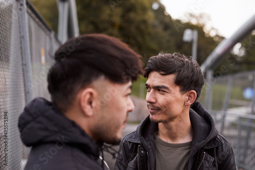 outdoors, day, two people, horizontal, looking away, waist up, standing, brunette, brown hair, short hair, smiling, people, adult, man, young men, optimism, positive, real people, lifestyle, friends, friendship, together, togetherness, colours, hoodie, leather jacket, scandinavia, sweden
