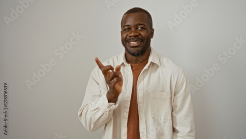 man, young, african, american, black, adult, photogenic, male, isolated, background, smiling, finger, gesture, expression, confident, attractive, person, portrait, casual attire, shirt, happy, posing, pointing, looking, positive, afro, stylish, face, friendly, mood, cheerful, joyful, studio, white, modern, minimal, individual, character, side, standing, neutral, light, plain, pattern, art, lifestyle, closeup, fashion, urban