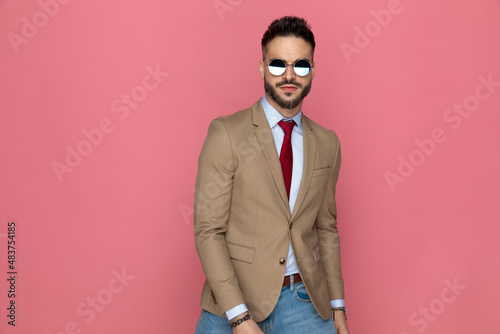 posing, attitude, style, cool, goggles, sunglasses, pair, man, guy, businessman, model, people, business, fashion, suit, attaching, jean, young, photogenic, sexy, attractive, looking, holding, hand, wearing, smiling, happy, pink, studio, background