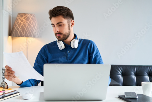 young, man, reading, document, working, home, laptop, sitting, male, computer, caucasian, desk, paperwork, home office, holding, domestic, copy space, finance, man, one person, people, serious, businessperson, indoor, entrepreneur, white, earphones