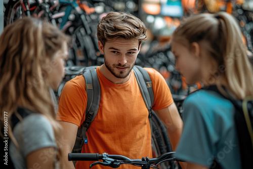 bicycle, bike, shop, store, choosing, buying, client, salesperson, retail, sale, advice, talking, discussing, man, woman, young, adult, bicycle, handlebar, looking, listening, transportation, sport, active, lifestyle, happy, smiling, modern, interior, business, commerce, consumerism, purchase, decision, help, assistance, product, service, showroom, display, new, equipment, gear, urban, city, cycling, healthy, fit, leisure