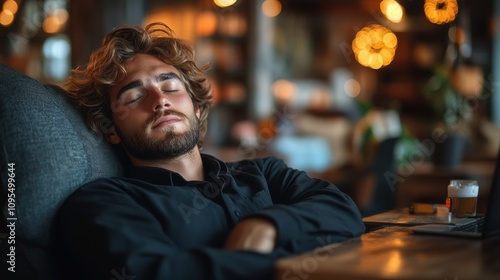 Young man resting with eyes closed, relaxed pose in cozy cafe, ambient lighting, peaceful break, unwind, calm atmosphere, comfortable setting