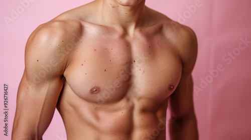 Young man showing muscular physique against a pink background during a fitness photoshoot