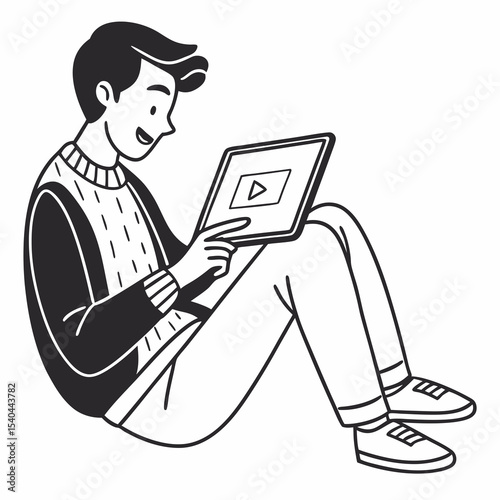 man, young, person, male, adult, sitting, floor, tablet, device, technology, digital, screen, video, watching, motion picture, entertainment, leisure, relax, comfortable, home, casual attire, sweater, pant, shoe, sneaker, lifestyle, illustration, line art, black-and-white, simple, minimalist, graphic, design, vector