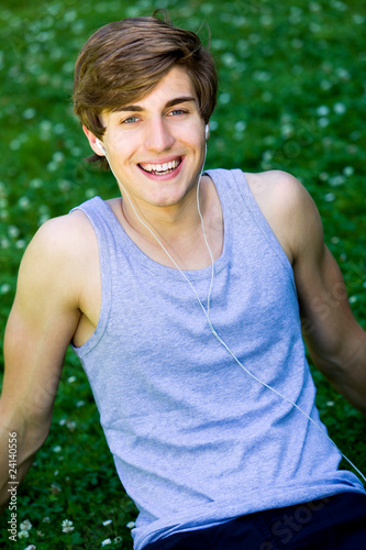 sport, people, young adult, man, male, boy, guy, one person, attractive, day, outdoors, caucasian, fitness, fresh air, jogging, jogger, lifestyle, activewear, park, smiling, happiness, smile, happy, cheerful, joy, break, resting, grass, lawn, sitting, relaxation