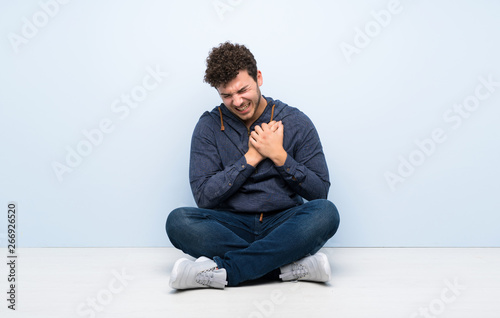 man, man, people, person, male, guy, casual attire, young, adult, hispanic, caucasian, curly, hair, seat, to sit, sitting, floor, wall, full, body, full-length, room, indoor, interior, pain, nubes, chest, attack, health, sick, disease, disease, painful, cardiac, heartache, unhealthy, emergency, injury, ache, disease, medicals, suffering, touching, hand, lumbar