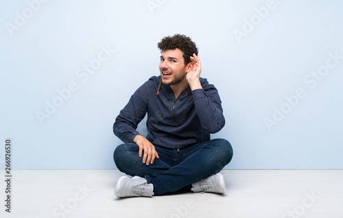 man, man, people, person, male, guy, casual attire, young, adult, hispanic, caucasian, curly, hair, seat, to sit, sitting, floor, wall, full, body, full-length, room, indoor, interior, listen, ear, hear, expression, concept, gesture, attentive, attention, secret, palm, news, communication, listening, hand, hearing, gossip, head, conversation, something, sound
