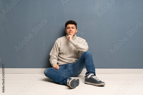 adult, attractive, caucasian, guy, photogenic, hispanic, latin, man, man, people, person, portrait, male, copy space, seat, to sit, floor, wall, blue, full, body, full-length, looking, forward, face, look, view