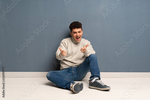 adult, attractive, caucasian, guy, photogenic, hispanic, latin, man, man, people, person, portrait, male, copy space, seat, to sit, floor, wall, blue, full, body, full-length, pointing, front, you, want, happy, expression, point, concept, gesture, smiling, looking, finger, view, success, smile, choose, hand